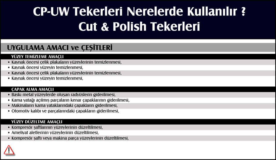 Surface Group Cut & Polish Tekerleri, yumuşak, orta ve sert yoğunluklarda üretilmektedir. Oldukça sık bir yapıda üretilen, dayanıklı, oldukça işlevsel bir üründür. Bu tekerlek, sert metallerde agresif çapak alma, yüzey düzeltme ve son işlem için ve taşınabilirliğin gerekli olduğu uygulamalar için oldukça iyi bir alternatiftir. Bu ürün, küçük çapların ve dar genişlikleri gerektiren işler için mükemmel bir başlangıç noktası sağlar.