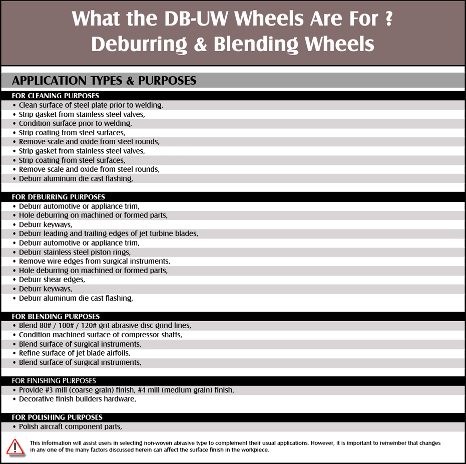 Surface Group Deburring & Blending Wheels combine the nonwoven abrasive technology of Polycrystalline Diamond (PCD /DIA). Deburring & Blending Unitized Wheel makes tough jobs like weld blending and heavy deburring fast and easy.