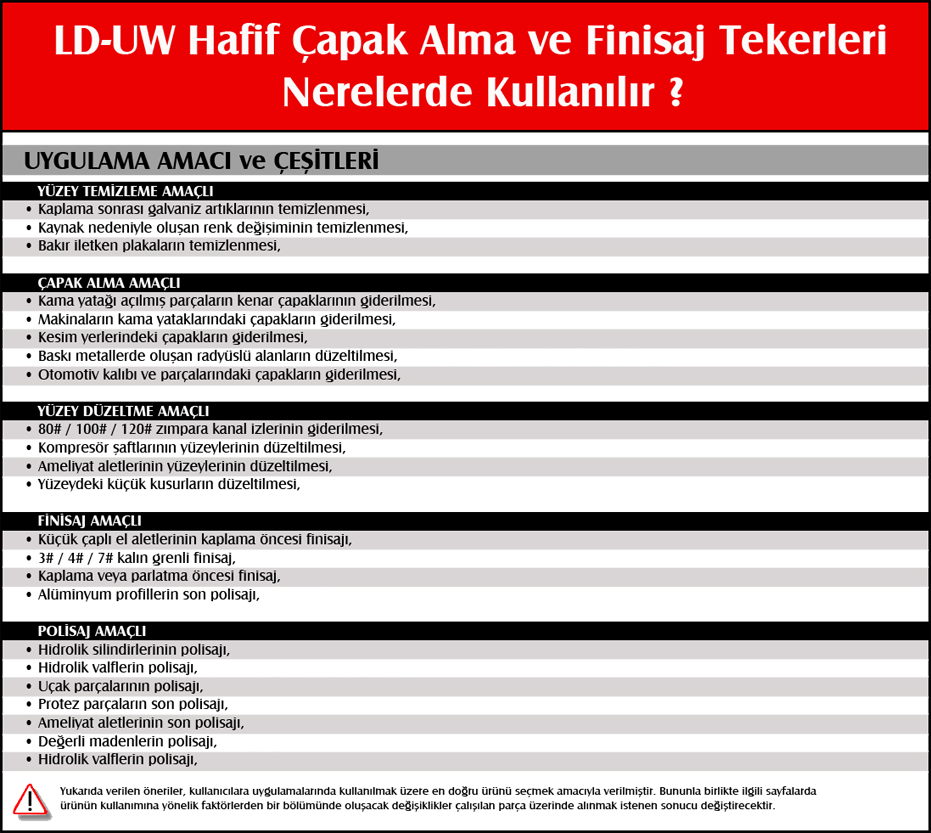 Bu tekerler malzemenin yüzeyi ile oldukça uyum içinde çalışır. Tüm metal çeşitlerinde oldukça çekici ve uyumlu finisaj yapmak üzere tasarlanmış tekerlerdir. Bu tekerler özellikle paslanmaz çelik, pirinç ve alüminyum ürün imalatçıları tarafından mükemmel yüzeyler sağlamakta kullanılır.