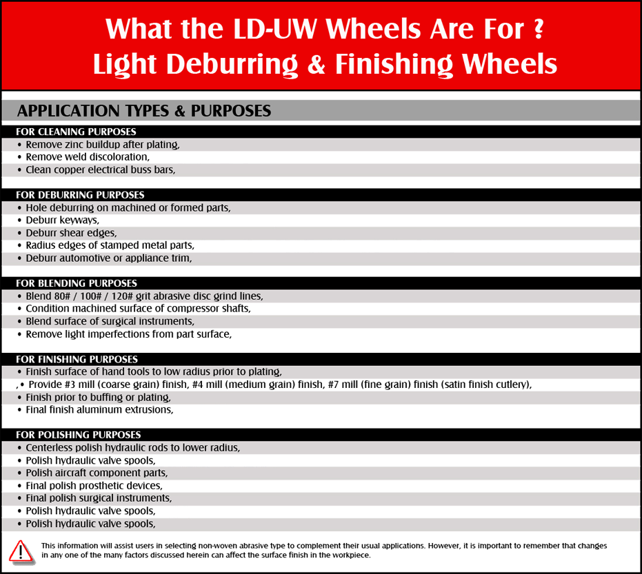 Surface Group Light Deburring & Polishing Wheels are one of the few wheel products that are offered in unitized form only, and a re-widely used for fine deburring and polishing because their conformability will maintain critical tolerances while still providing a fine polished finish.
