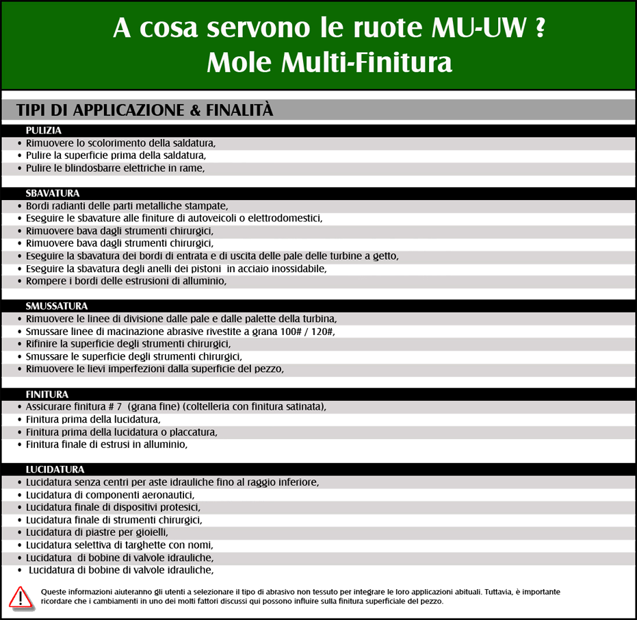 Le ruote a disco Multi-Finitura del Surface Group sono più facili da usare rispetto a lucidanti, composti e altri abrasivi di finitura e, come tutti i nostri prodotti, garantiscono risultati professionali. Sono un ottimo punto di partenza quando l'applicazione richiede una finitura o una pulizia di precisione.