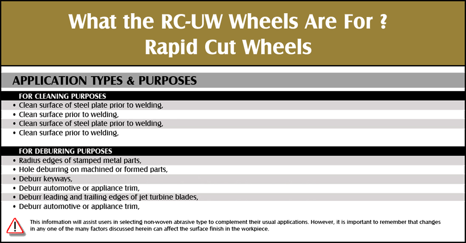 Surface Group Rapid Cut Wheel combines the nonwoven abrasive technology of ceramic Grain. Rapid Cut Unitized Wheel makes tough jobs like weld blending and heavy deburring fast and easy.