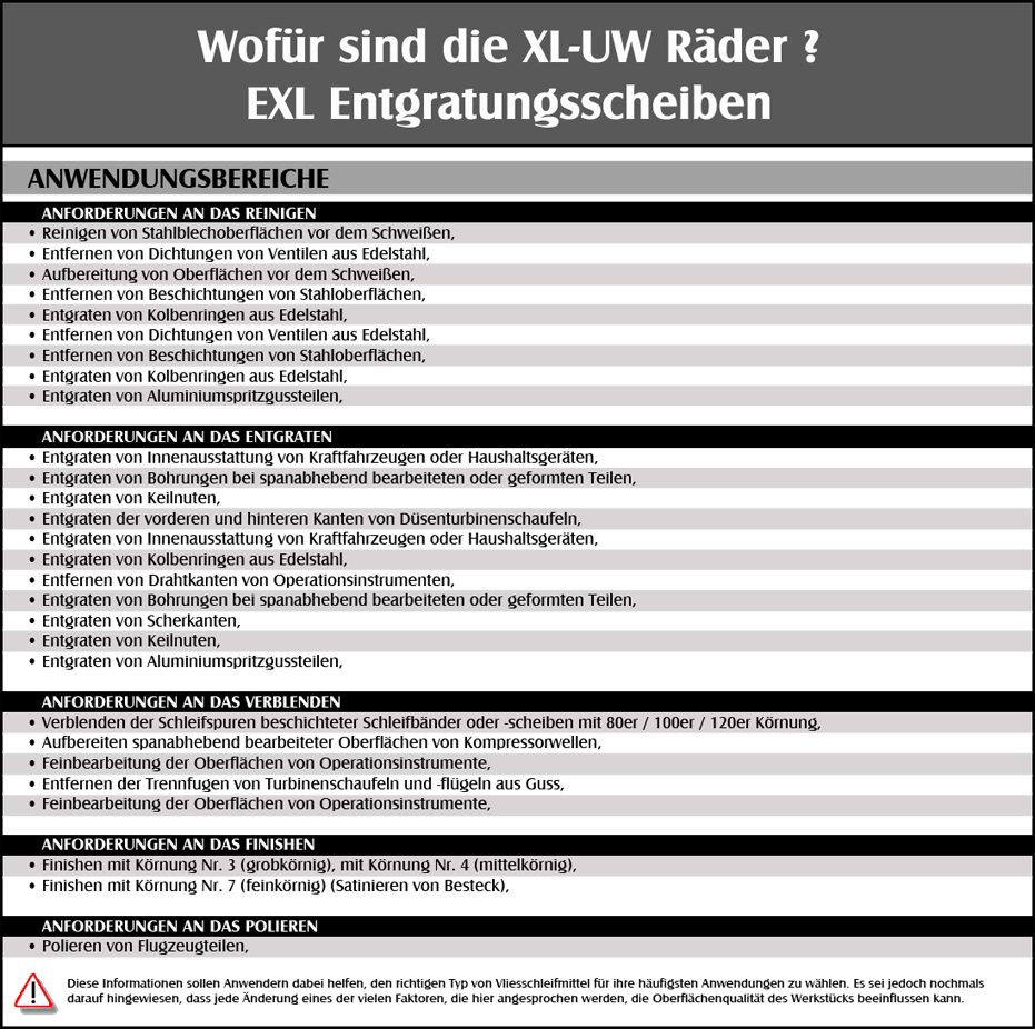 Surface Group EXL Entgratungs- und Polierscheiben kommen mit schwierigen Aufgaben beim Verblenden und Finishen bestens zurecht. Sie liefern rasche und einheitliche Ergebnisse und werden gerne eingesetzt, wo früher konventionelle Schleifkörper wie gummigebundene Schleifscheiben, Schruppscheiben und Vliesfächerscheiben verwendet wurden.