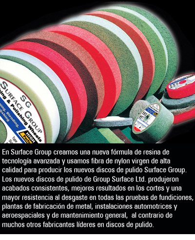 En Surface Group creamos una nueva fórmula de resina de tecnología avanzada y usamos fibra de nylon virgen de alta calidad para producir los nuevos discos de pulido Surface Group Ltd. Los nuevos discos de pulido de Surface Group produjeron acabados consistentes, mejores resultados en los cortes y una mayor resistencia al desgaste en todas las pruebas de fundiciones, plantas de fabricación de metal, instalaciones automotrices y aeroespaciales y de mantenimiento en general, al contrario de muchos otros fabricantes líderes en discos de pulido.